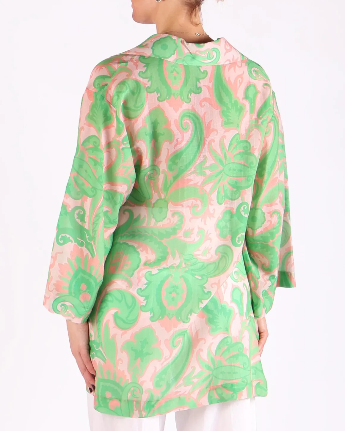Deze groene lange losse blouse van ETRO heeft een gedurfde all-over print, die een opvallende toevoeging is aan je garderobe. Gemaakt van super fijne ademende katoen, biedt het zowel comfort als elegantie, waardoor het perfect is voor de zomer. De losse pasvorm zorgt voor een relaxte, vloeiende silhouet, terwijl de print het een unieke en verfijnde uitstraling geeft. Ideaal voor zowel casual als geklede gelegenheden, combineert deze blouse moeiteloos stijl met functionaliteit.