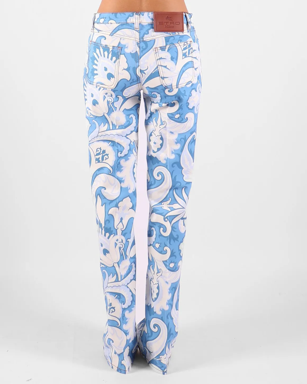 Deze blauwe broek van Etro heeft een opvallend wit paisleypatroon, wat een elegante en artistieke uitstraling geeft aan het ontwerp. De zachte stof zorgt voor comfort, terwijl het paisleypatroon een tijdloze, bohemien uitstraling biedt. Perfect voor zowel casual als semi-formele looks, deze broek combineert moeiteloos stijl met een unieke flair.