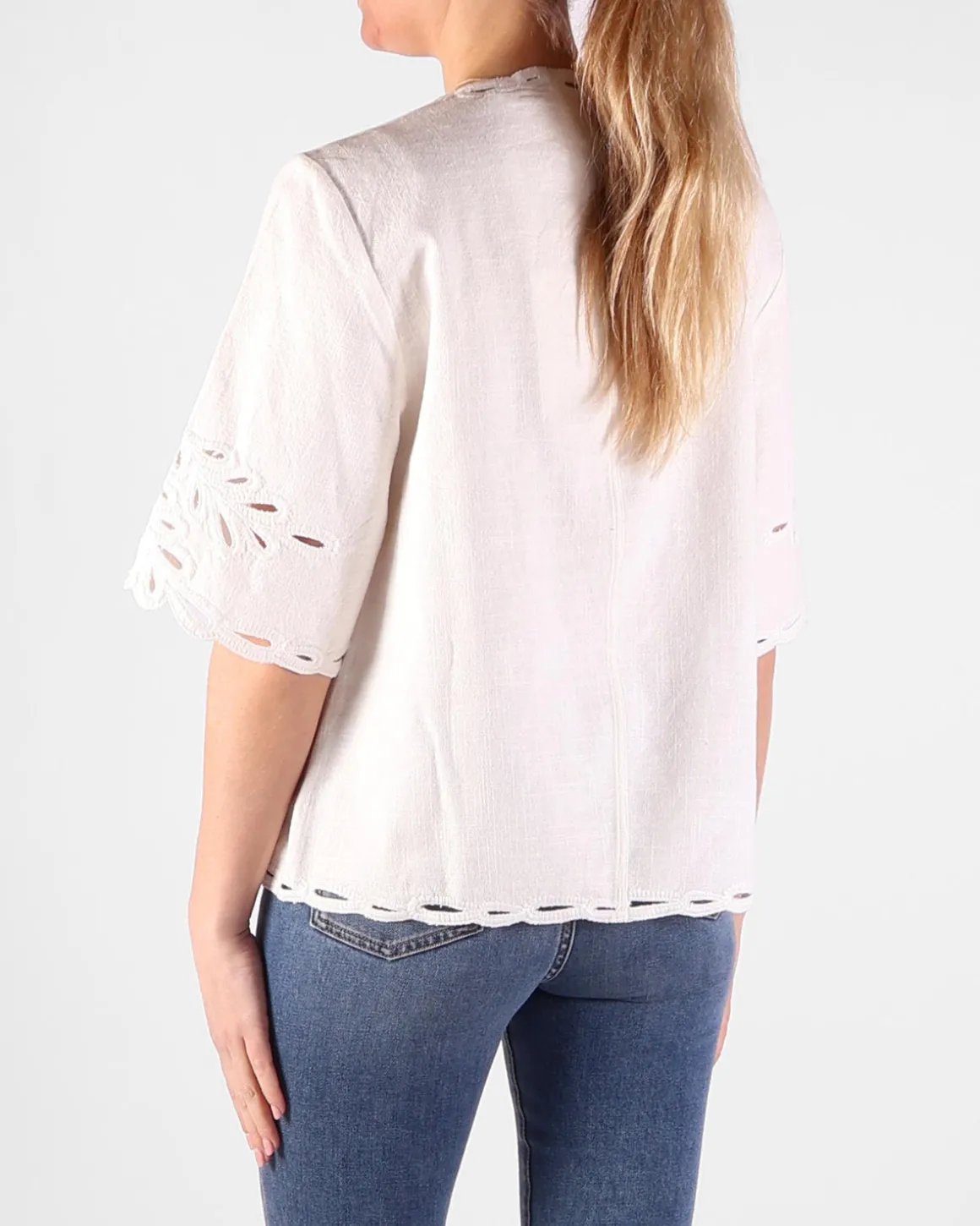 Deze witte blouse van Isabel Marant is een prachtig gedetailleerd stuk met cutwork-accenten op de halslijn, mouwen en de zoom van de taille, wat een delicate en vrouwelijke touch toevoegt. Gemaakt van lichtgewicht stof, biedt het een relaxte pasvorm terwijl het een elegante silhouette behoudt. Het verfijnde cutwork-ontwerp maakt het perfect voor zowel casual als chique gelegenheden. De frisse witte kleur voegt veelzijdigheid toe en kan gemakkelijk worden gecombineerd met verschillende onderstukken.