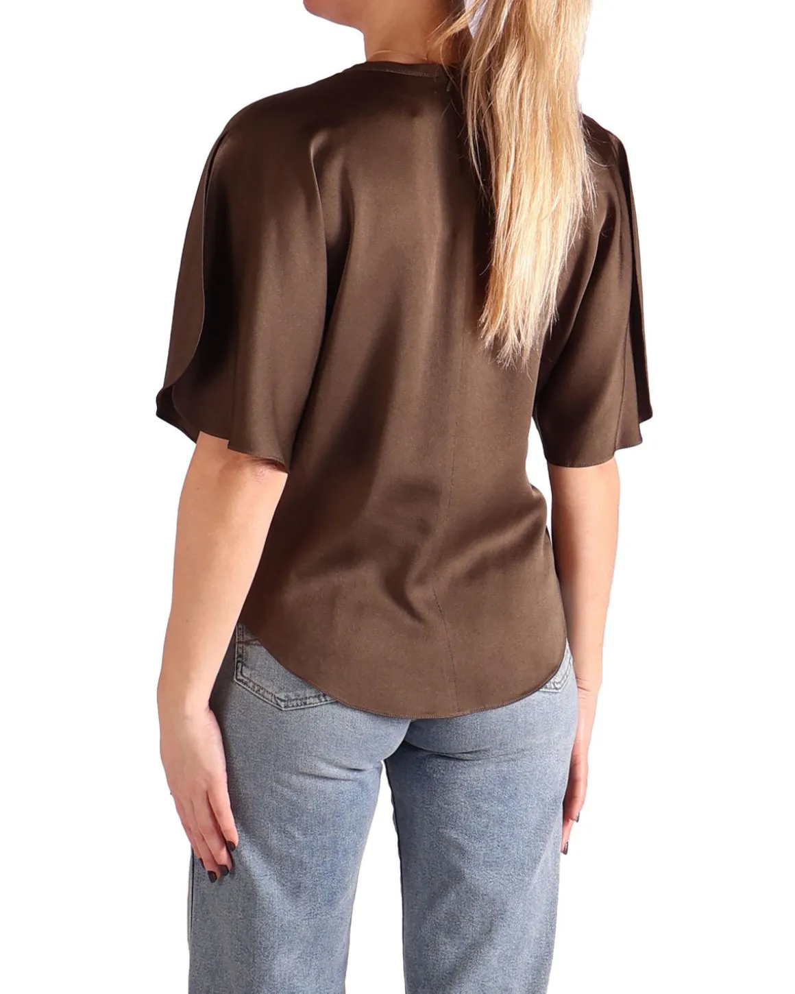 Deze bruine satijnen zijden top van Isabel Marant heeft speelse fladderende mouwen met een dubbel-laags petalontwerp, waarbij de ene laag elegant over de andere valt en een uniek en dynamisch effect creëert. De rijke bruine kleur en de zachte stof maken het perfect voor elke gelegenheid, van casual uitjes tot meer verfijnde evenementen. Het flatterende model biedt comfort en accentueert je natuurlijke vorm.