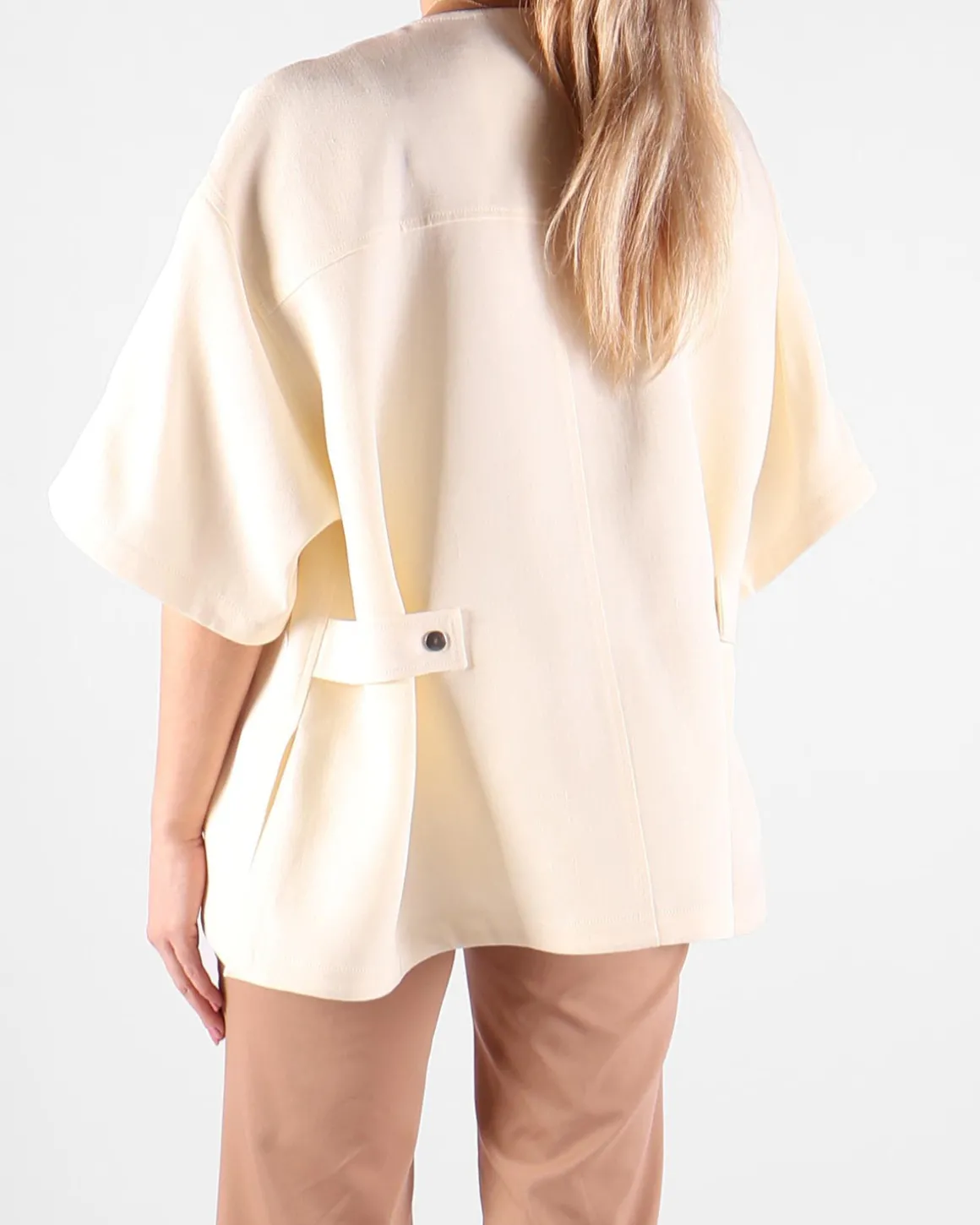 Deze ivoorkleurige jas van Jil Sander heeft een eigentijds ontwerp met drop shoulders en losse korte mouwen, wat het een ontspannen maar verfijnde uitstraling geeft. De zachte ivoorkleur voegt een vleugje verfijning toe, waardoor de jas veelzijdig is voor verschillende outfits, of je nu voor een casual of meer geklede look kiest. Het minimalistische ontwerp zorgt ervoor dat het moeiteloos te combineren is met andere stukken, wat een chique, moderne silhouet creëert. De unieke gouden knopen voegen een luxe detail toe aan het ontwerp.