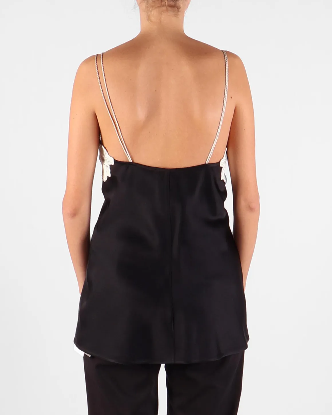 Deze zwarte top van Jil Sander heeft een elegante en verfijnde uitstraling. De dunne schouderbandjes zorgen voor een subtiele, delicate look, terwijl de witte kanten details een romantische touch toevoegen. Perfect voor een chique en minimalistische stijl met een luxe afwerking.