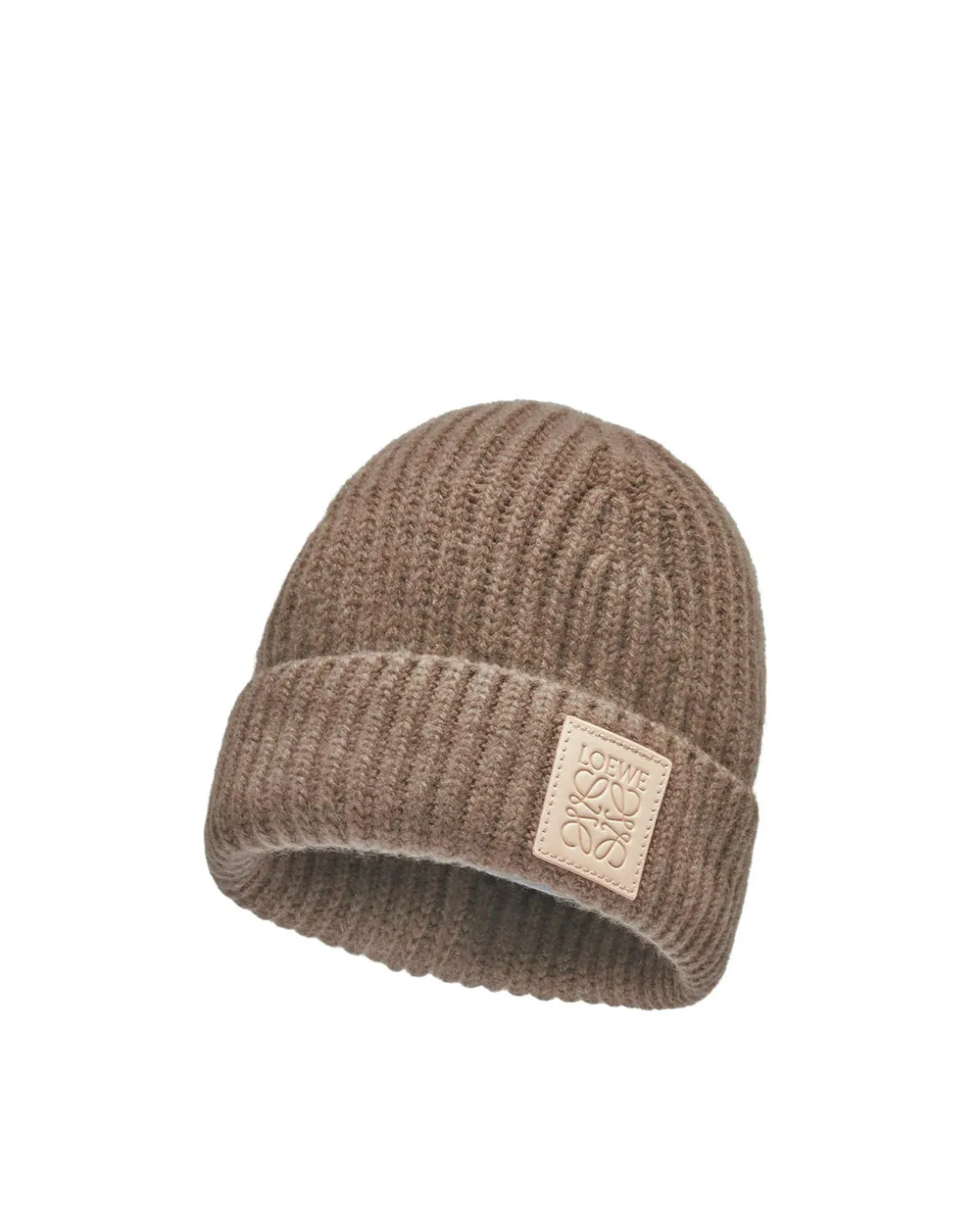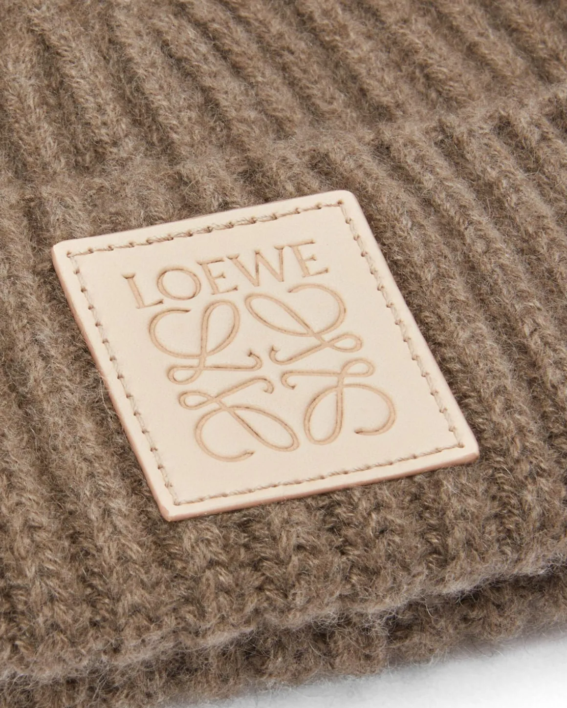 Deze stijlvolle mutts van Loewe in beige/taupe is gemaakt van luxueus ribgebreid kasjmier voor ultiem comfort en warmte. Het heeft een kort model met een trendy omgeslagen rand en is afgewerkt met het iconische Loewe leren label aan de voorkant. De perfecte combinatie van elegantie en functionaliteit voor je wintergarderobe.