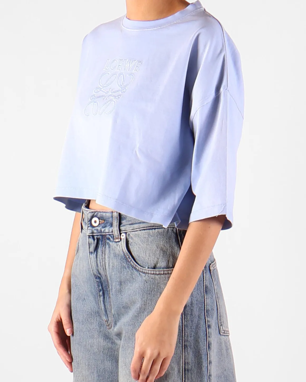 Dit lichtblauwe korte T-shirt van Loewe heeft een ontspannen en stijlvolle uitstraling. Het logo is op de voorkant geborduurd, wat een kenmerkende touch aan het ontwerp toevoegt. Met de drop shoulders en de losse pasvorm creëert dit T-shirt een moeiteloze, nonchalante look die zowel comfortabel als trendy is. De lichtblauwe kleur maakt het veelzijdig, perfect om te combineren met verschillende outfits, van casual jeans tot meer verfijnde broeken.