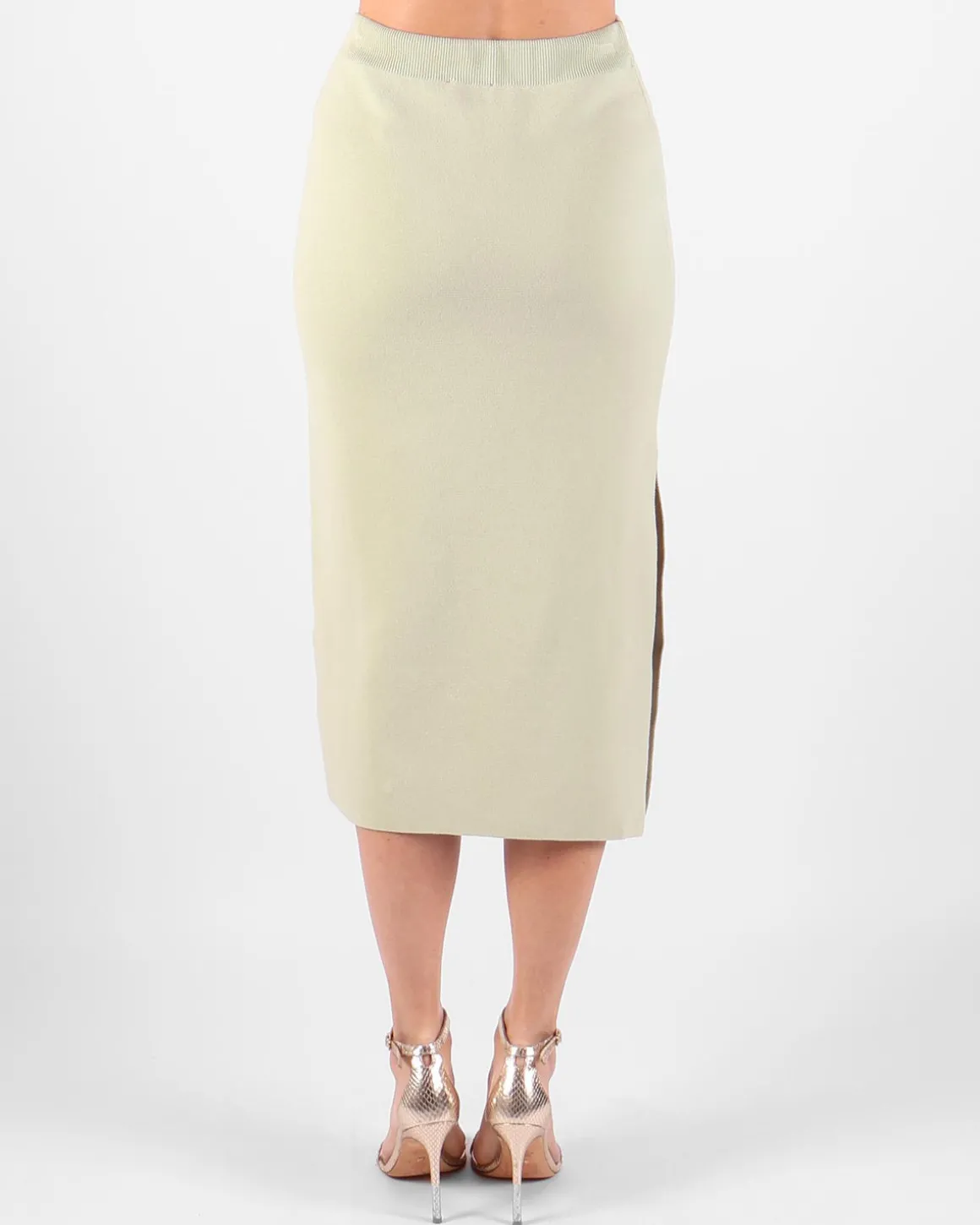 Deze lichtgroene rok van Nude brand heeft een elegante en strakke uitstraling, met een subtiele zijsplit die een moderne touch toevoegt. De zachte stof valt mooi, waardoor een flatterend silhouet ontstaat. De frisse kleur maakt de rok veelzijdig, waardoor hij makkelijk te combineren is met verschillende tops. Perfect voor zowel casual als meer verfijnde outfits. De rok biedt een perfecte balans tussen eenvoud en stijl, ideaal voor moeiteloze, chique looks.