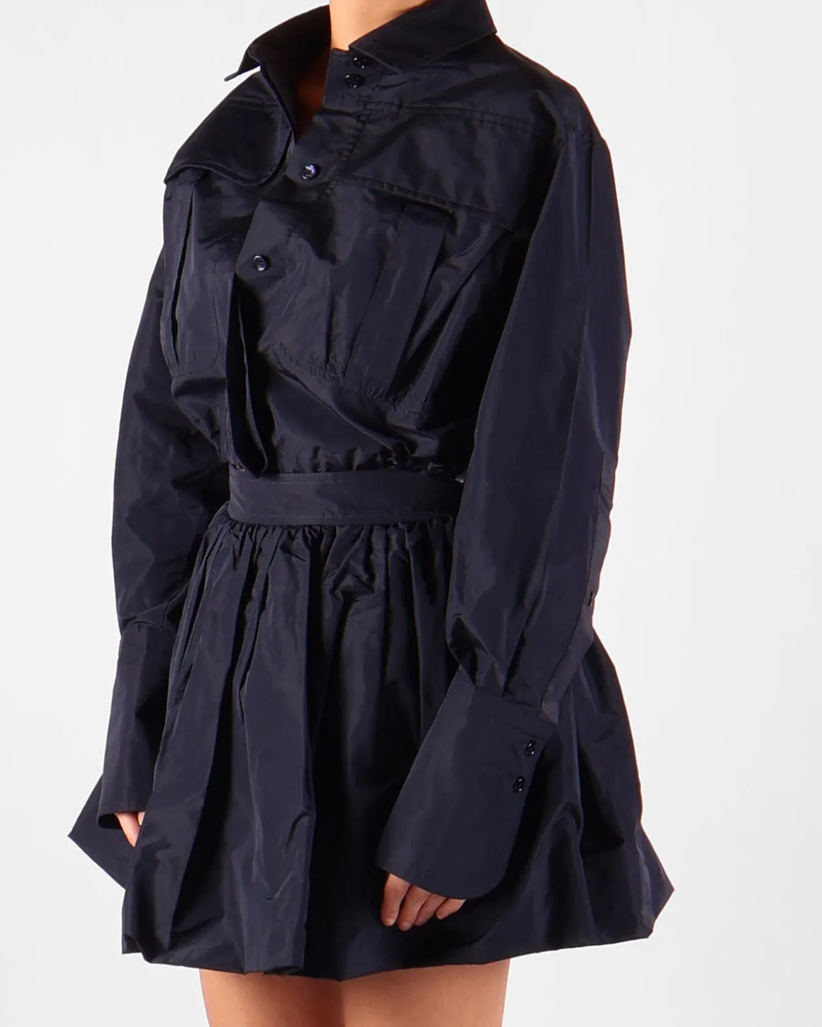 Dit navy korte T-shirt van Patou combineert casual elegantie met een modern ontwerp. De pullover taille kan aan de achterkant worden gestrikt, waardoor de pasvorm kan worden aangepast en het silhouet wordt benadrukt. De flapzakken aan de voorkant voegen een praktisch en stijlvol detail toe, terwijl de knoopsluiting aan de voorkant en de kraag een klassieke uitstraling geven. De achterkant heeft een dubbele laag, waarbij de bovenste laag een split heeft, waardoor je een glimp van de binnenkant ziet voor een unieke en modieuze twist. Perfect voor een veelzijdige look, dit T-shirt is gemakkelijk te combineren met verschillende onderstukken.
