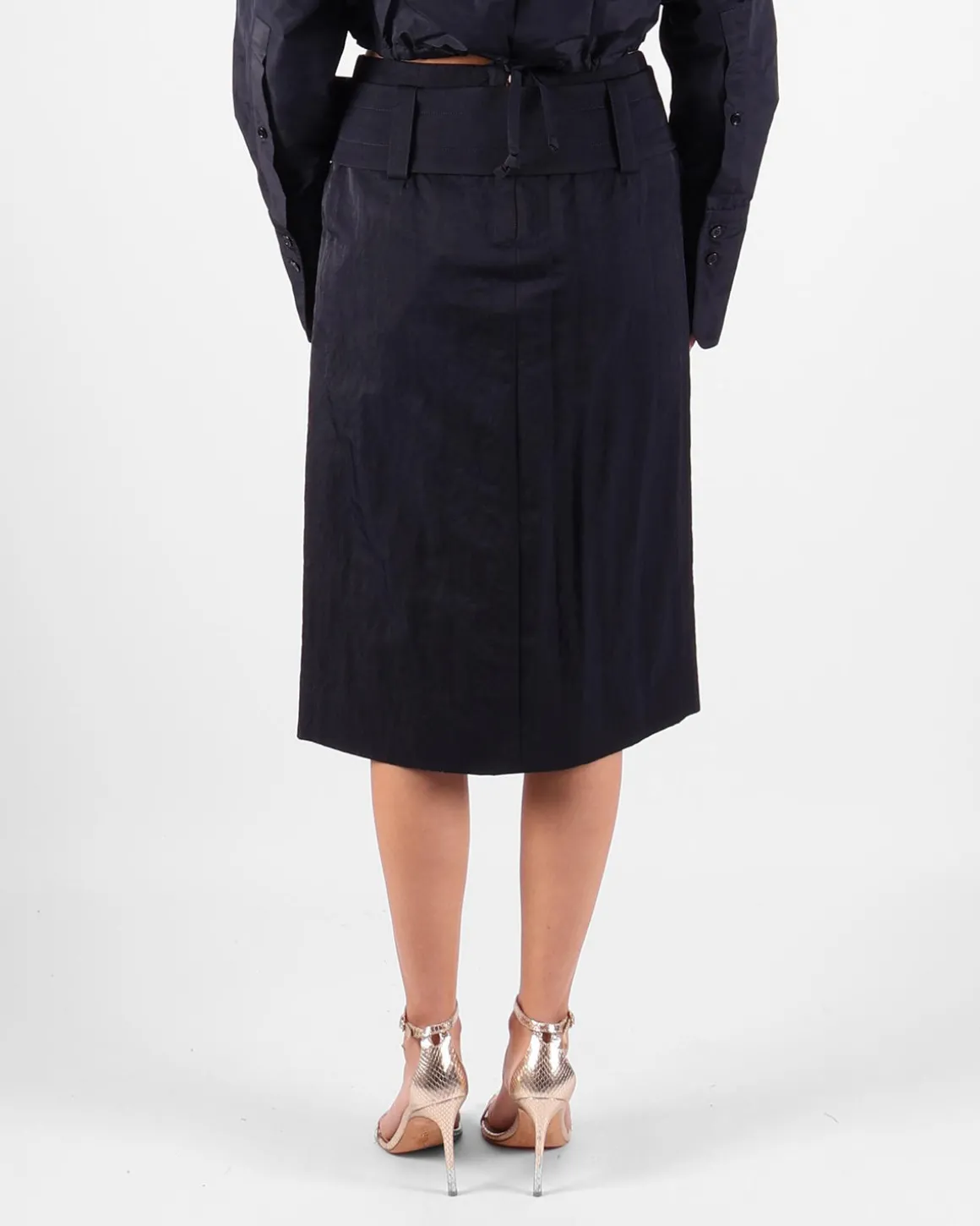 Deze navy blauwe rok van Patou heeft een elegante, maar moderne stijl. De split aan de voorkant voegt een subtiele vleugje allure toe, terwijl de brede zelfstrikband in de taille het silhouet benadrukt en een chique detail aan het ontwerp toevoegt. De diepe navy kleur maakt het veelzijdig en gemakkelijk te combineren met verschillende tops, perfect voor zowel casual als geklede gelegenheden.