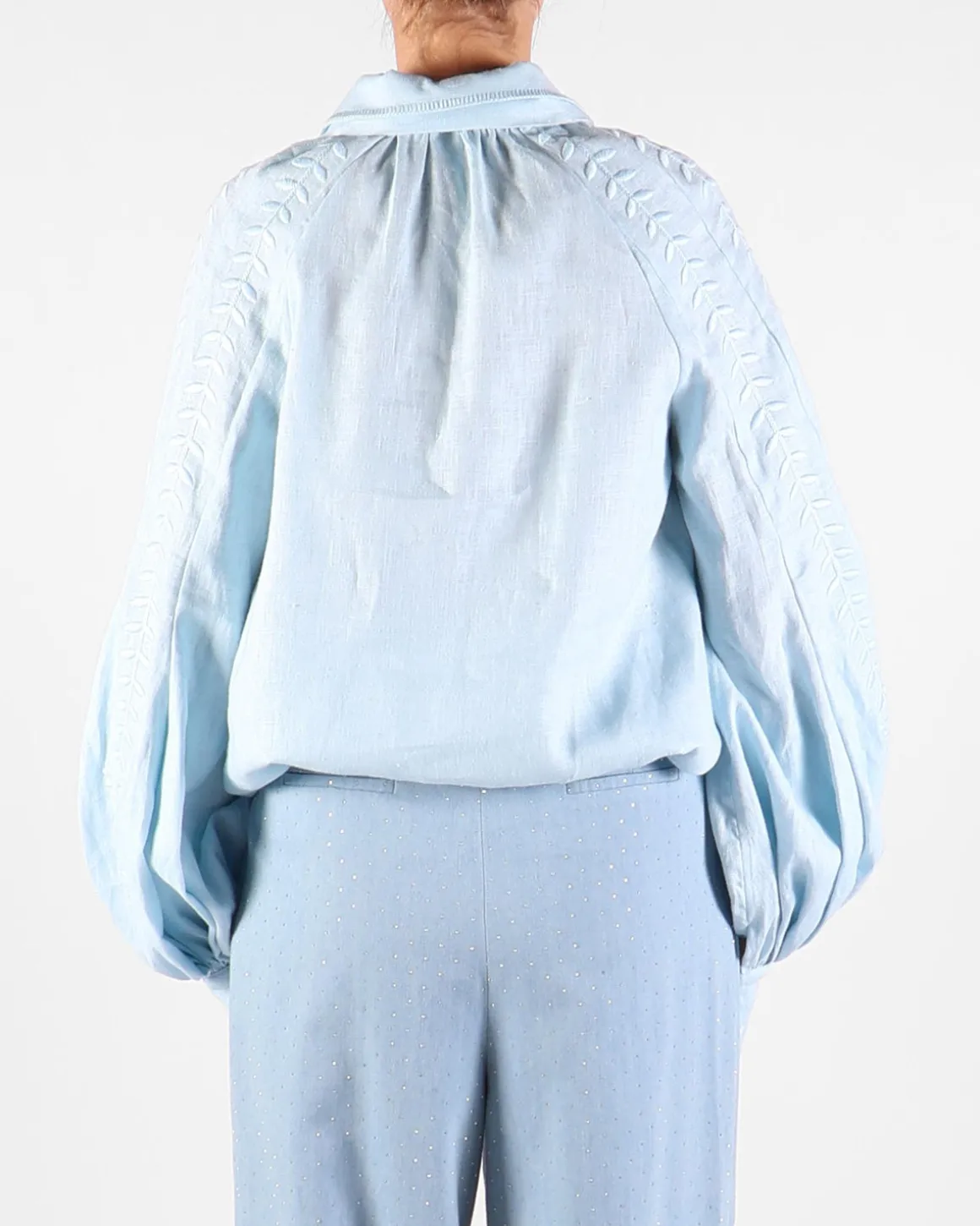 Deze lichtblauwe blouse van Sage & Ivy straalt verfijning en elegantie uit. De delicate geborduurde details voegen een subtiele, romantische touch toe. Perfect voor een moeiteloos chique en vrouwelijke look.