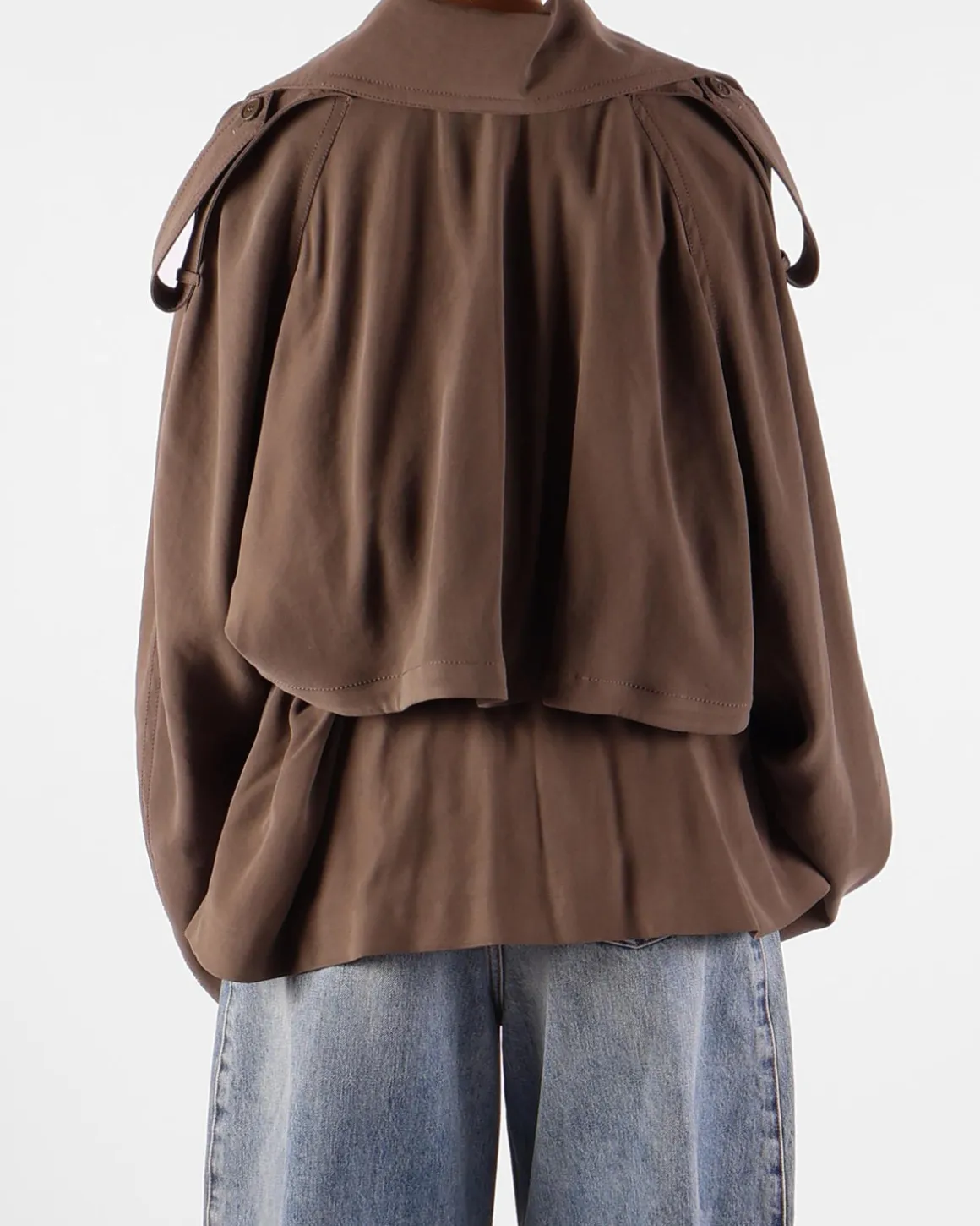 Deze khaki kleurige jas van het merk The Andamane biedt een opvallend en verfijnd ontwerp. De brede kraag en de zelfkleurige riem creëren een slanke en flatterende silhouet. De gebonden mouwhemlijnen voegen een stijlvolle detail toe, terwijl de unieke draping op één kant, van schouder tot mouw en aan de achterkant, een eigentijdse elegantie toevoegt. De kenmerkende laagvorming maakt de jas tot een opvallend stuk, perfect voor zowel casual als meer verfijnde looks.